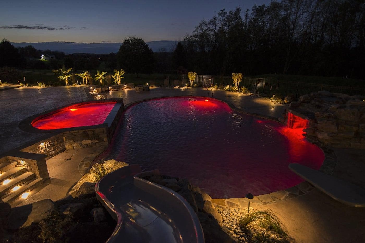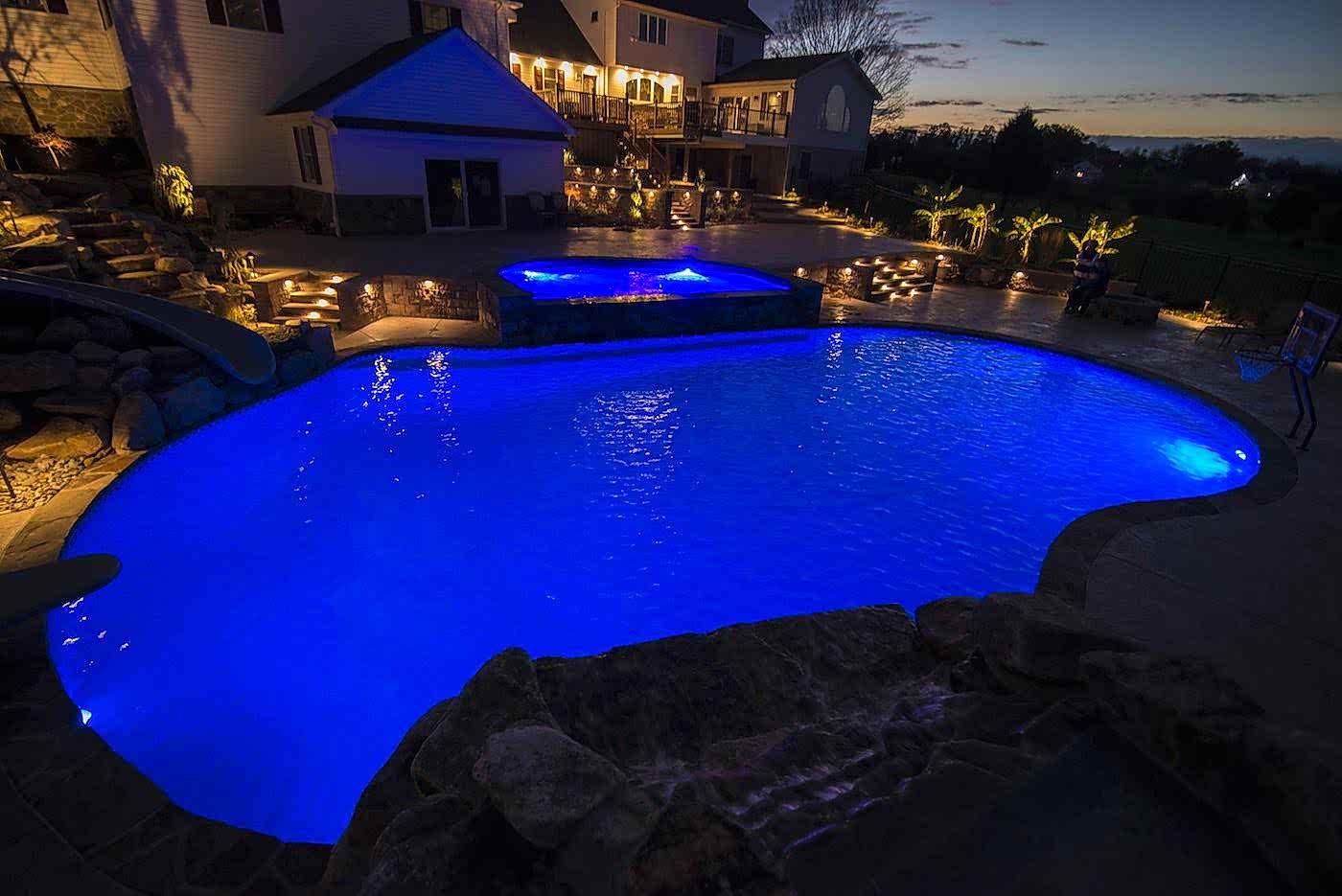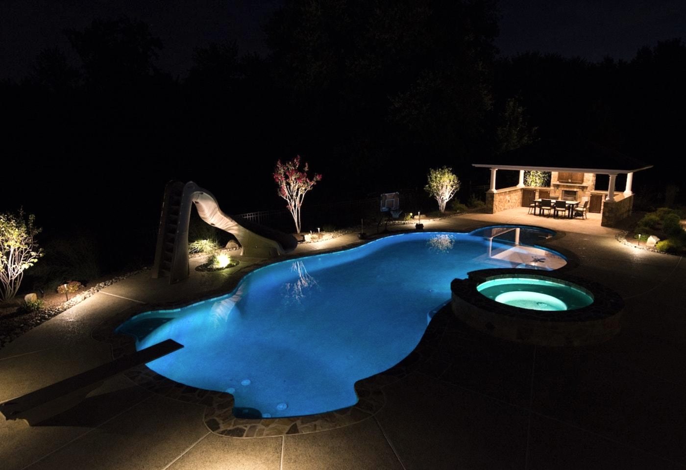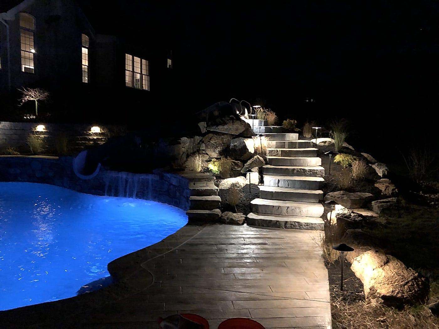 We are a full-service Landscape Lighting Pool company with the ability to design, install and maintain a custom landscape light package for your house and pool. As well as adding security and safety to unlit areas, the Pool Lighting services adds that soft glow to really showcase anything you want to light up during the night. Our systems can also be operated wirelessly via Bluetooth from any smart device and can be set a variety of ways!